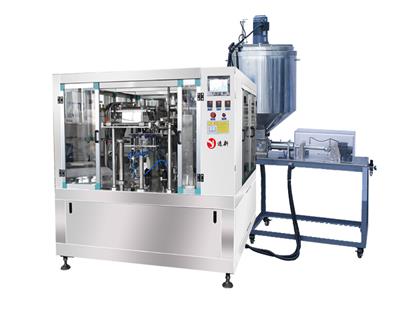 包裝物料: 300型給袋式全自動液體包裝機組特別適合計量包裝液體、膏體類的物料,如:純凈水、火鍋底料、防水涂料、豆沙醬、建筑膠水等液體、膏體類物料。